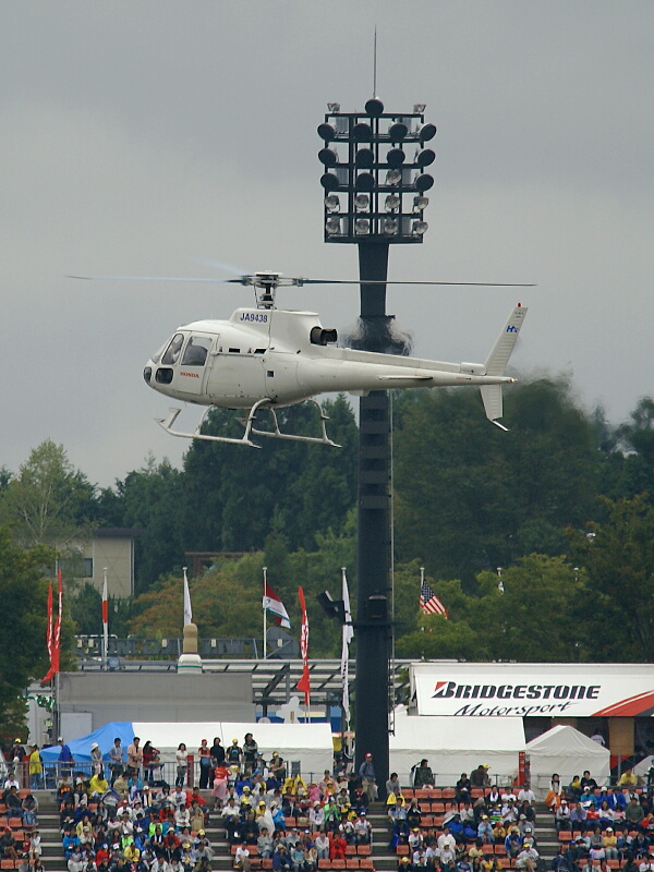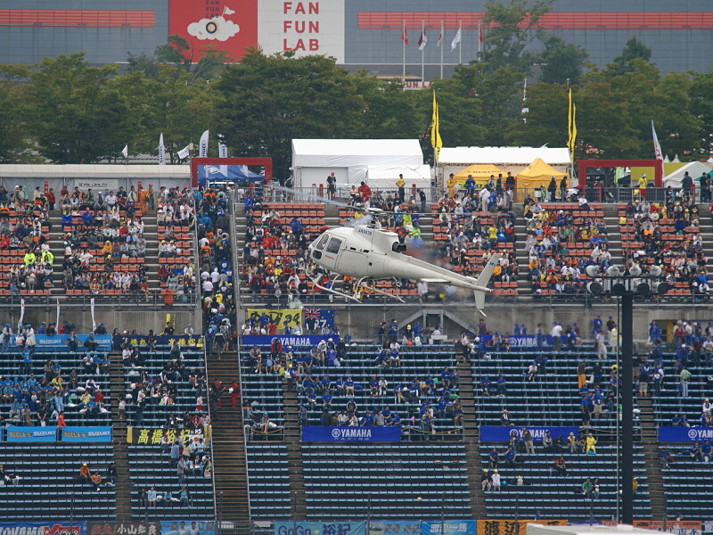 頭上で旋回した後、コース内のヘリポートに降りて行きました。
